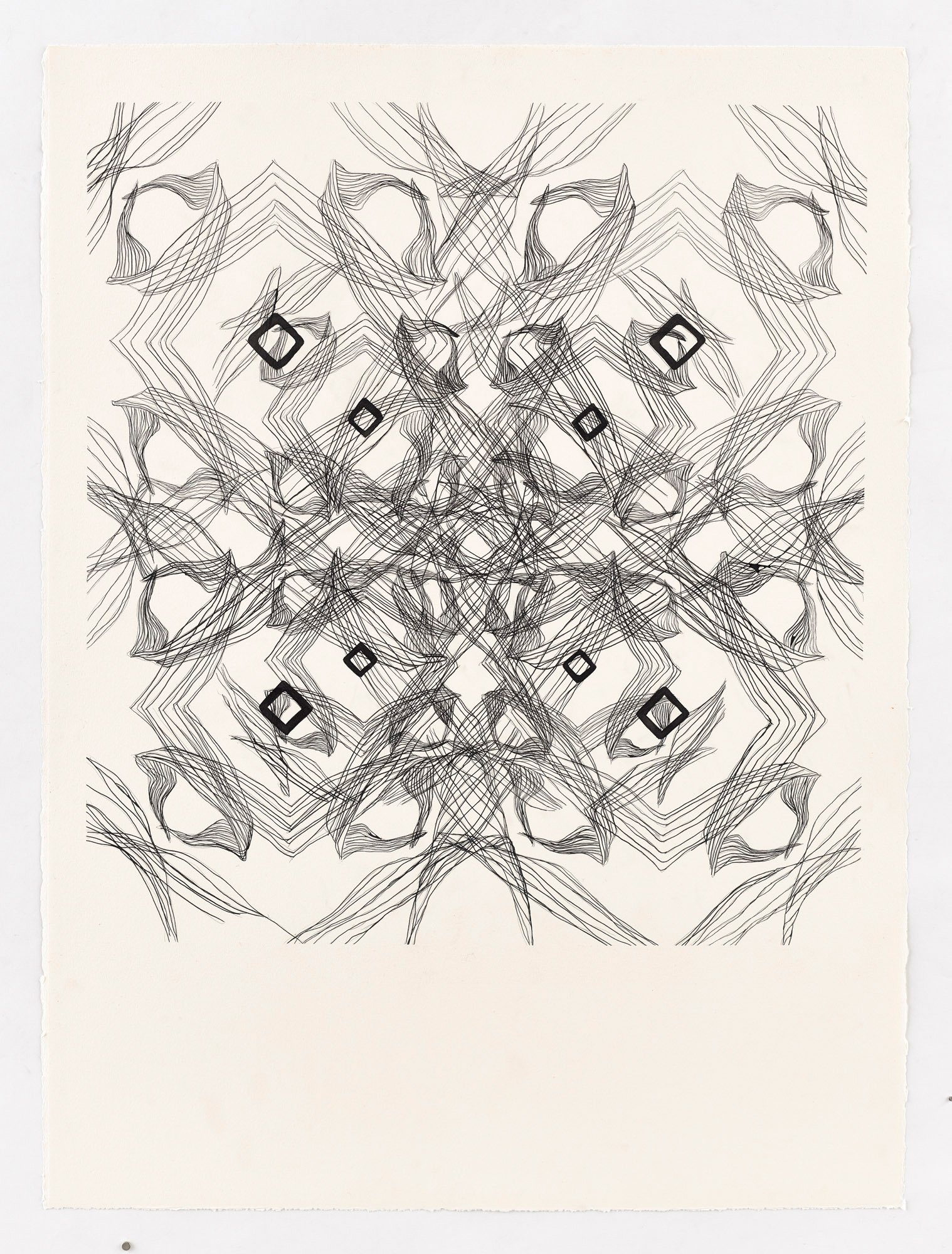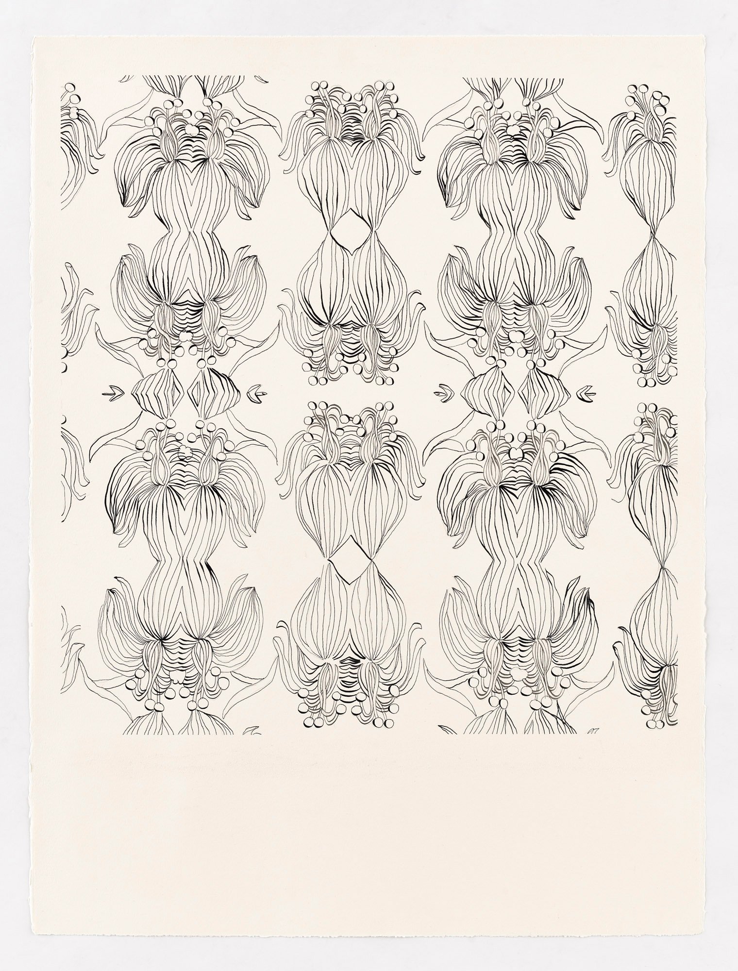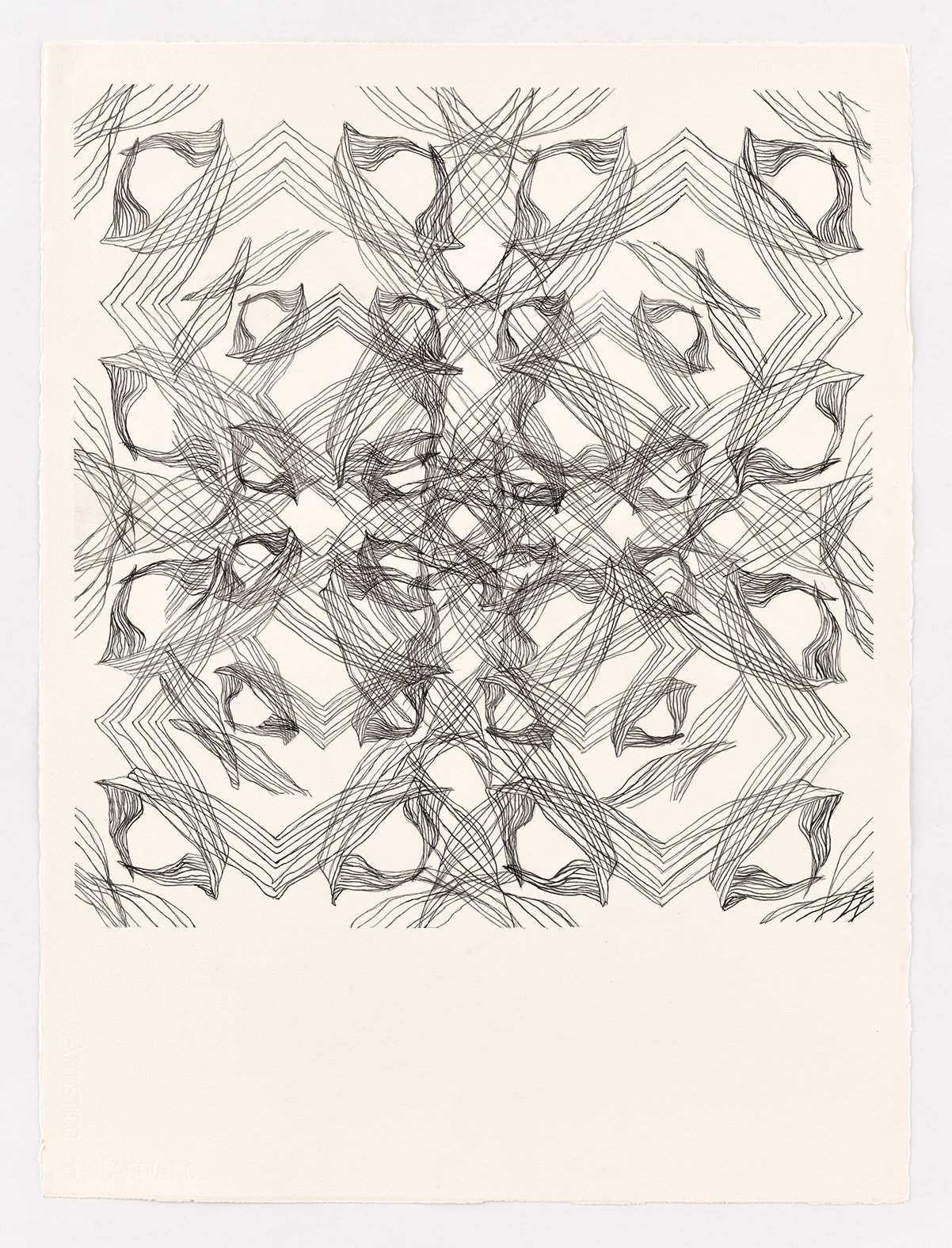 These drawings begin with analog sketches that are digitally mirrored and reconfigured into patterned templates. Each pattern is then drawn twice, forming a pair of near-twins that echo the same structure but never fully coincide, as small deviations emerge from the artist’s hand. The titles are AI-generated, allowing the system to interpret the works on its own terms and introducing a parallel form of authorship. The works shown here are drawn from a larger body of work.