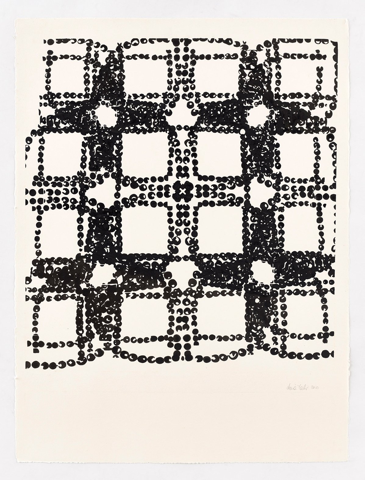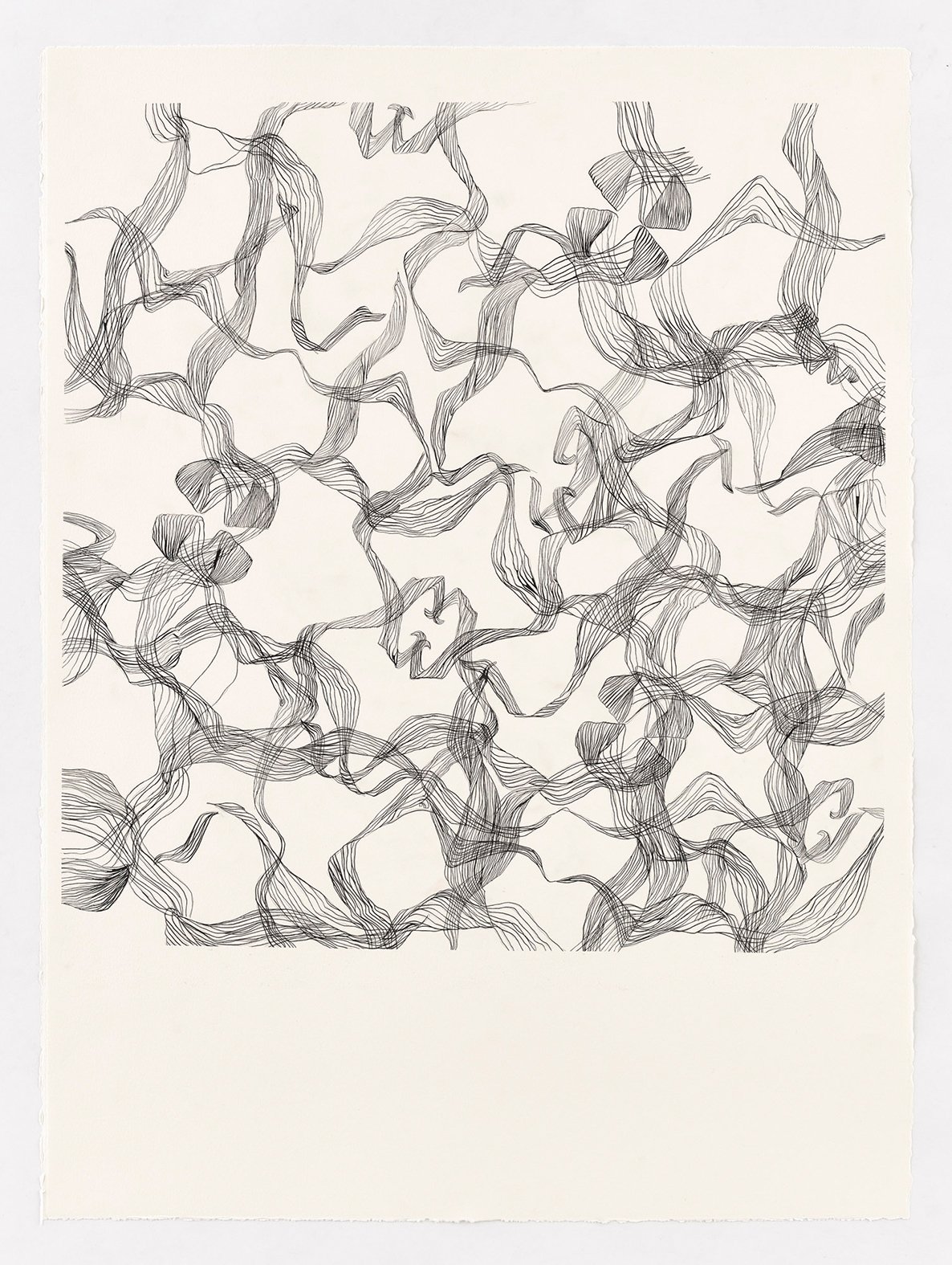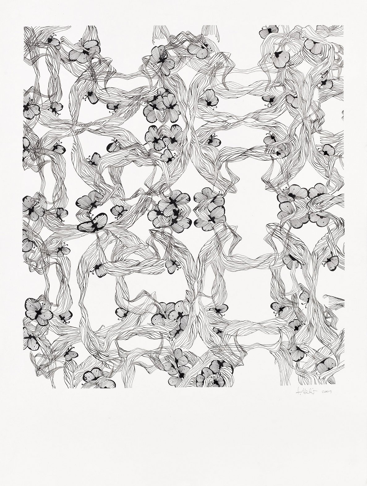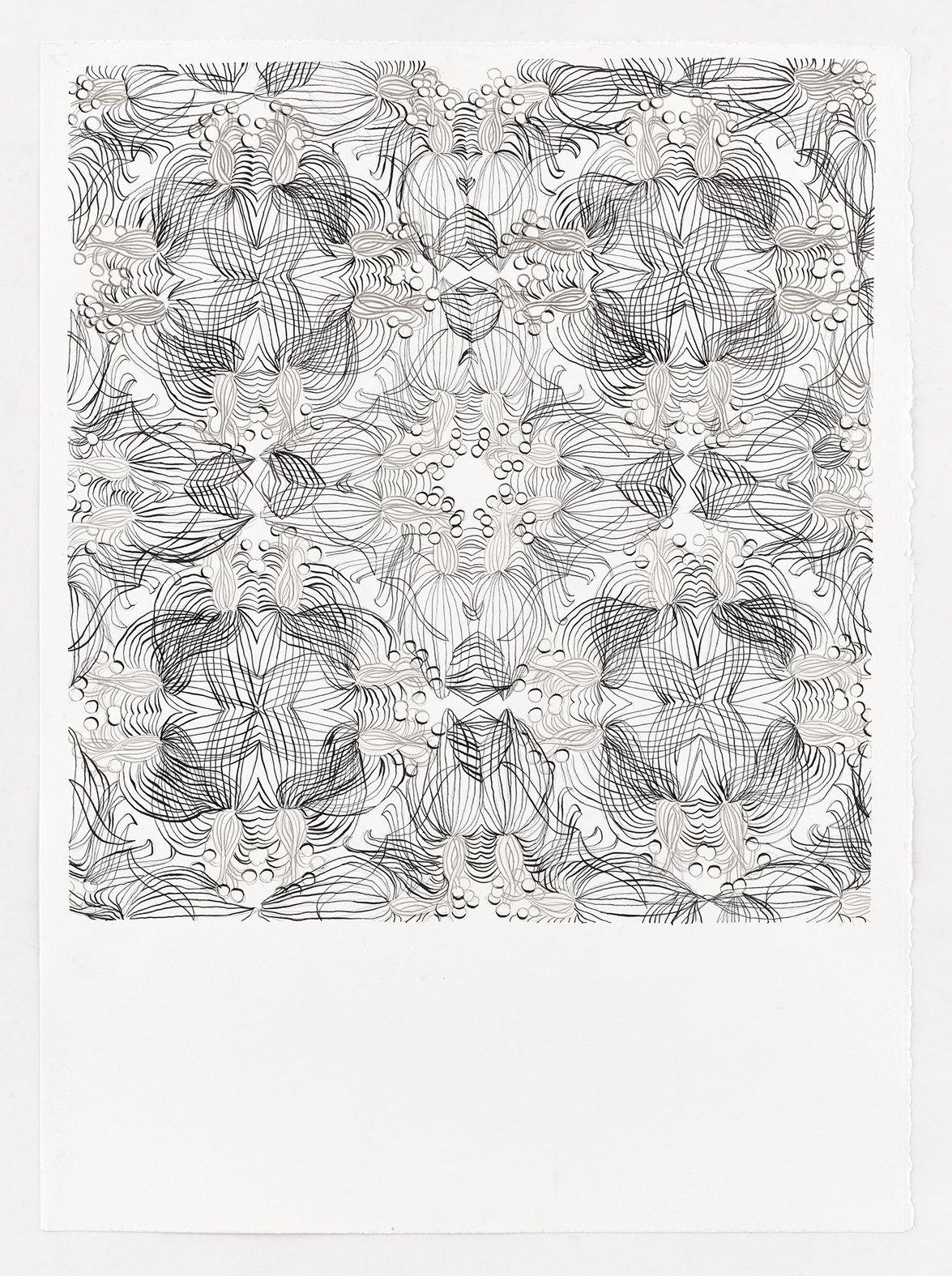 These drawings begin with analog sketches that are digitally mirrored and reconfigured into patterned templates. Each pattern is then drawn twice, forming a pair of near-twins that echo the same structure but never fully coincide, as small deviations emerge from the artist’s hand. The titles are AI-generated, allowing the system to interpret the works on its own terms and introducing a parallel form of authorship. The works shown here are drawn from a larger body of work.